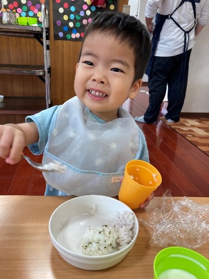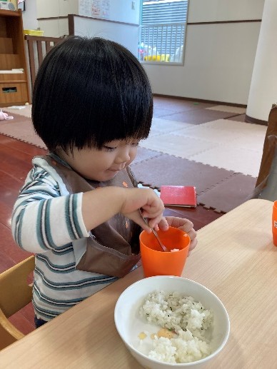 振るのが難しい子は調理員や保育士がお手伝いをして