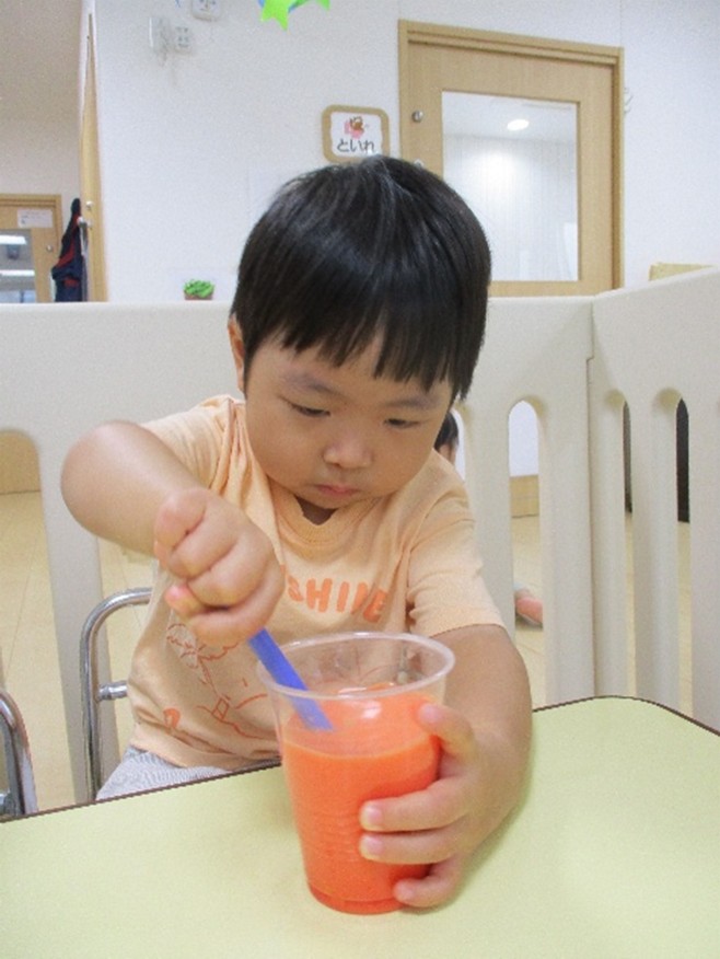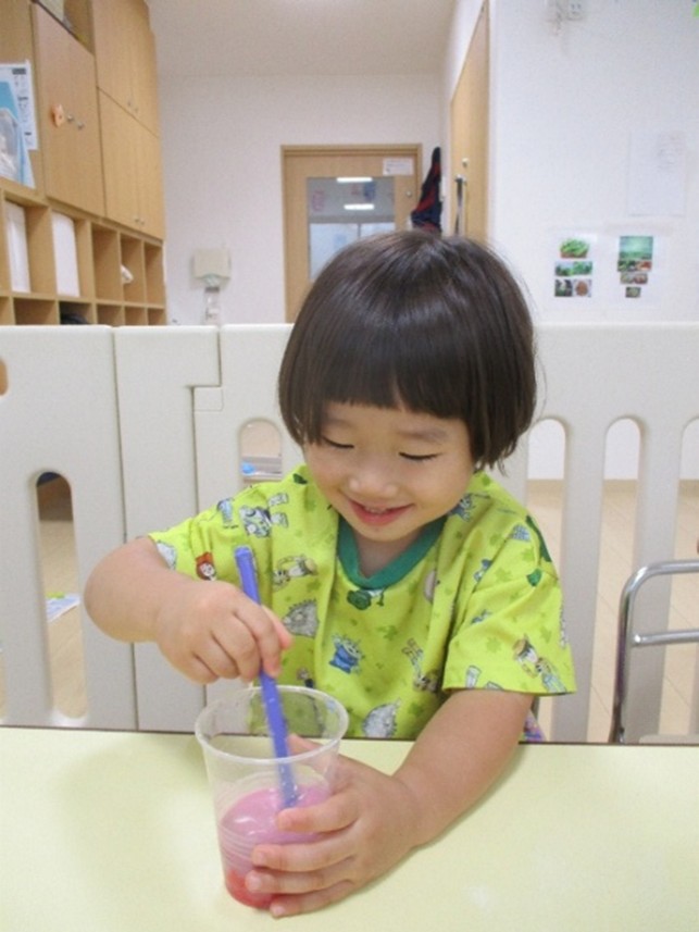 完成した色水を見て「〇〇ジュースみたい」とジュースに見立てる姿も