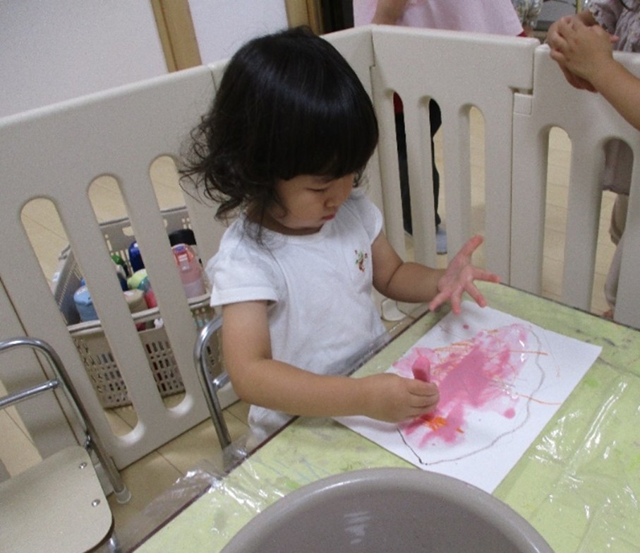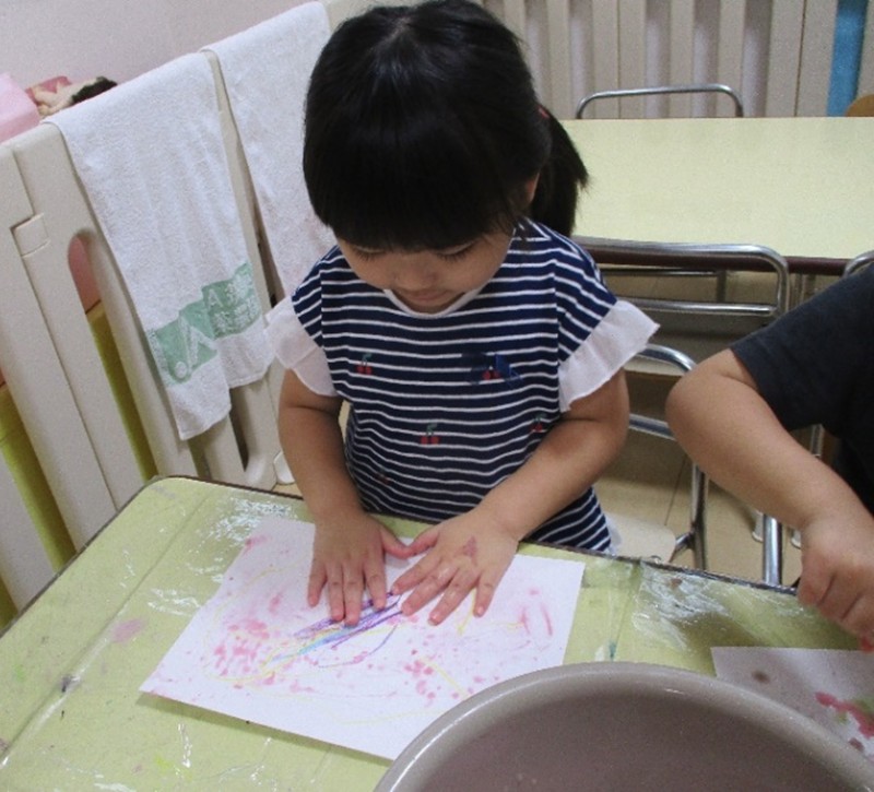 画用紙の上に溜まっている水を叩き感触を楽しんでいました。