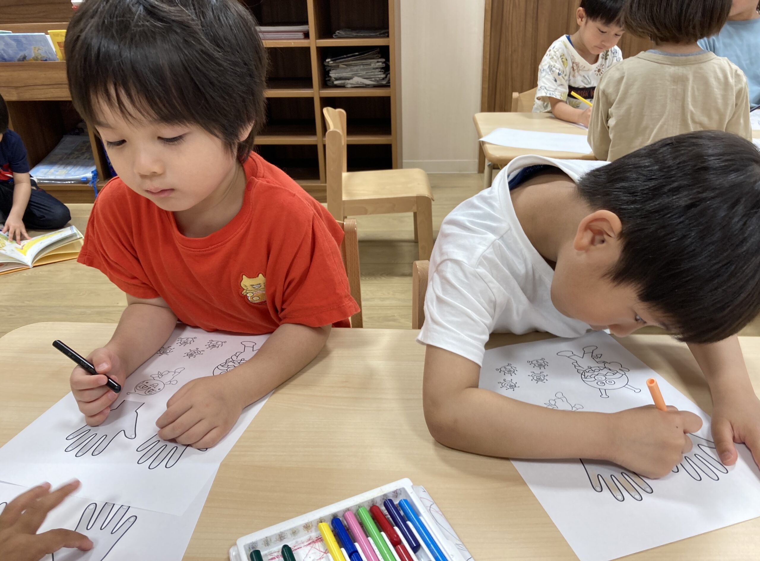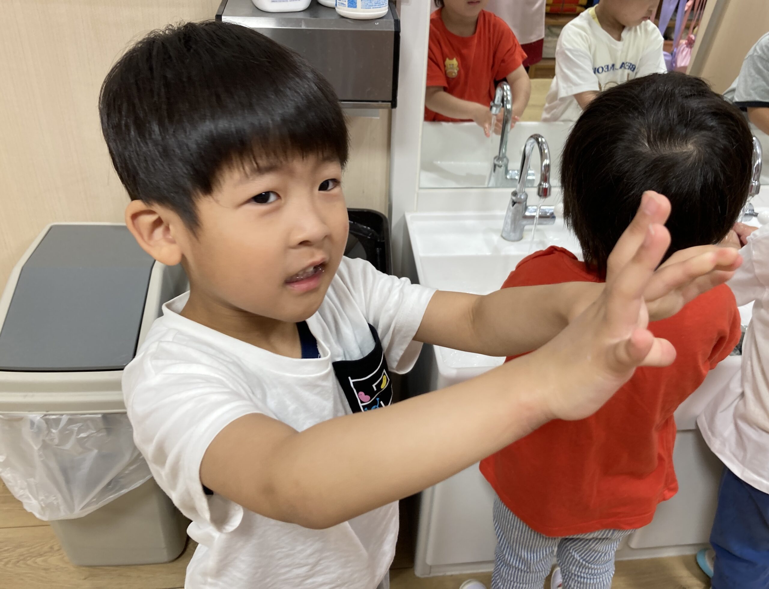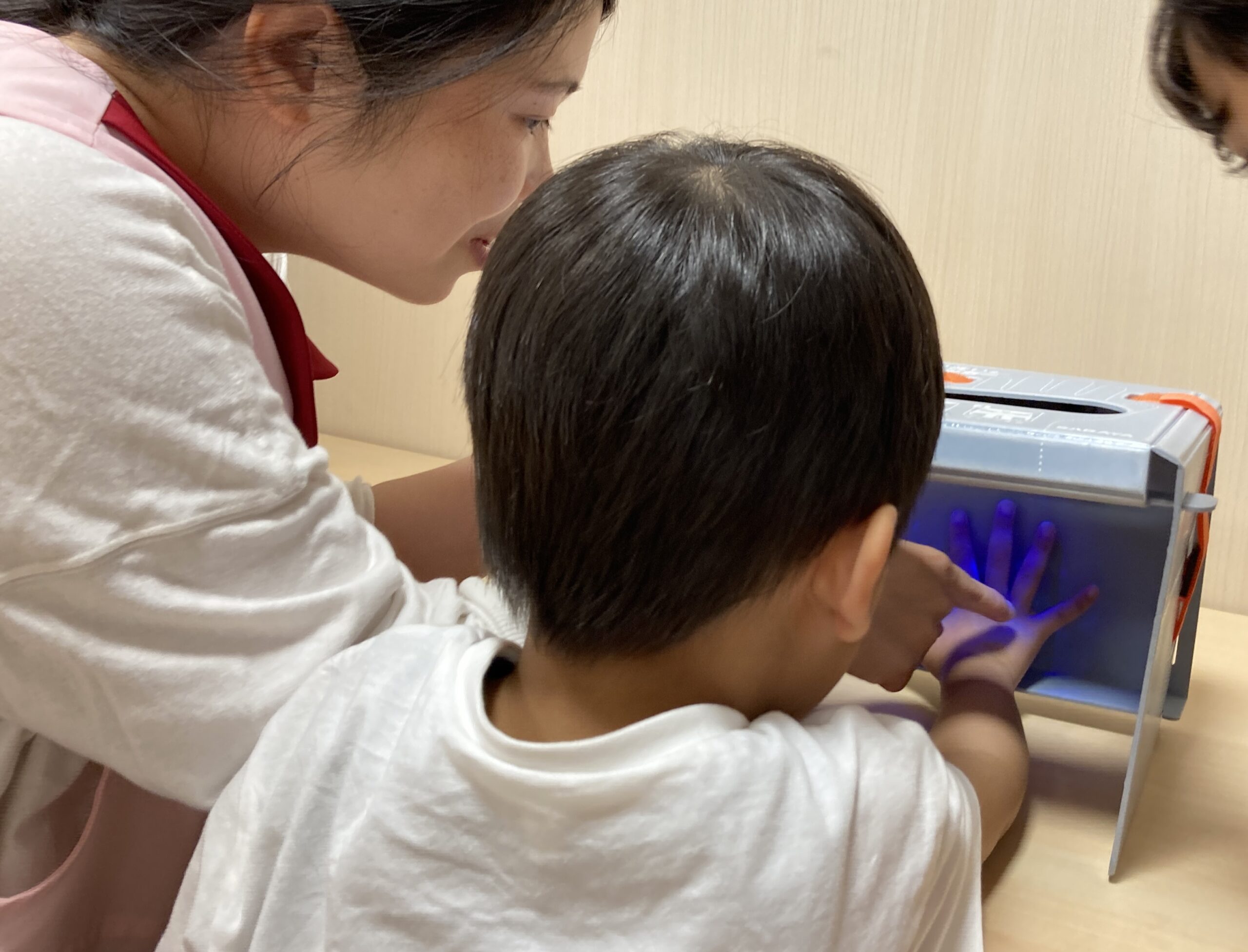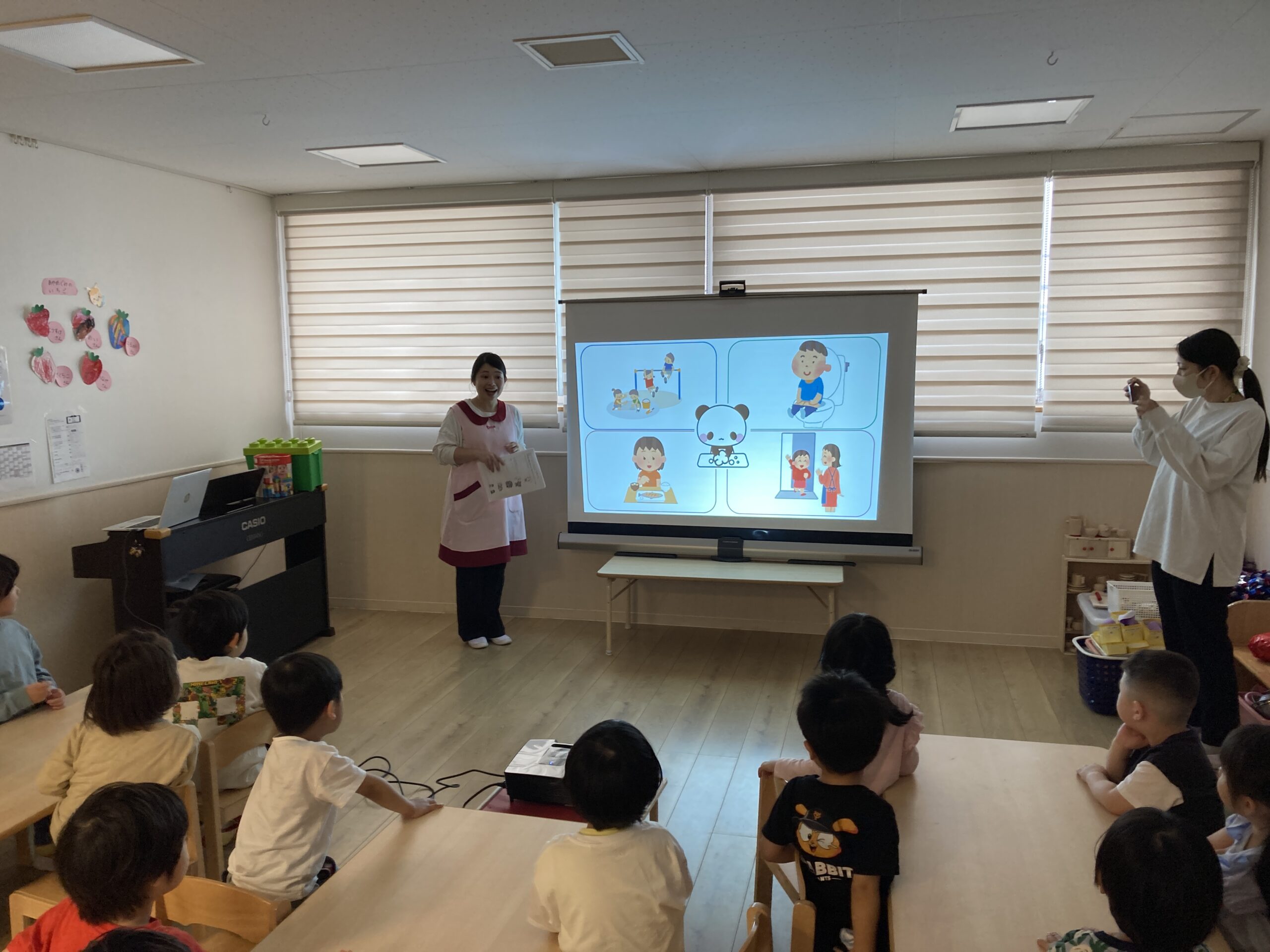 ほっぺるだより Letter TOP ほっぺるだより 手洗い指導 ほっぺるランド 佃大橋 手洗い指導 ほっぺるランド佃大橋では、5月に手洗い指導を行いました。 どんな時に手を洗う?みんなで一緒にスライドを見ながらお勉強! 手を洗った後、ぬり絵を使って洗い残しが多いと思う場所を塗り塗り✎ 果たしてぬり絵で塗ったところは本当に洗い残しが多いのか? 特殊な石鹸を使って手を洗った後に、 「手洗いチェッカー」という名前の機械に手を入れると…洗い残し発見! 洗い残しがなくなるように手洗いの歌にあわせてしっかりと練習! これでみんな上手に手を洗うことができますね♪ ほっぺるだより Letter ほっぺるランド 佃大橋 佃煮でおにぎりを作ろう ほっぺるランド 佃大橋 水遊び開き集会 ほっぺるランド 佃大橋 月島運動場にて(4月11日)