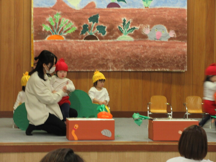 舞台での発表に緊張しながらも、お友だちと一緒にしようという姿が見られた2歳児さん。