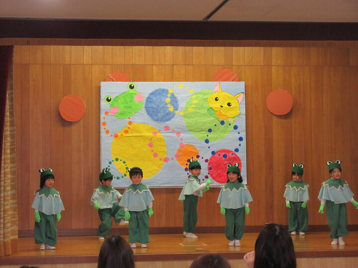 初めての舞台、ここはどこ?と思いながら、保育室で聴いていた曲や歌が聞こえてくるといつも通りの子ども達の様子を見て頂くことができました。