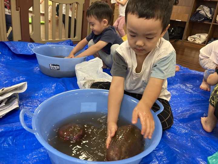 土のにおい、おいもの形・重さを感じながら
