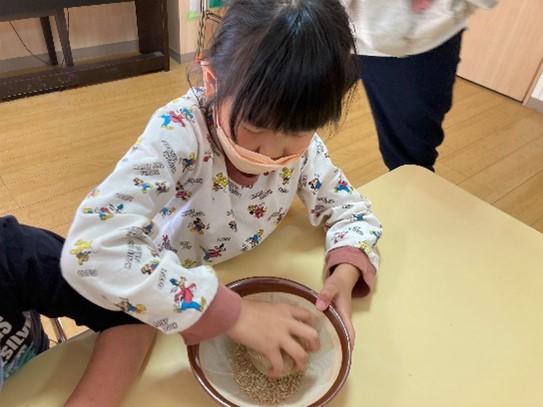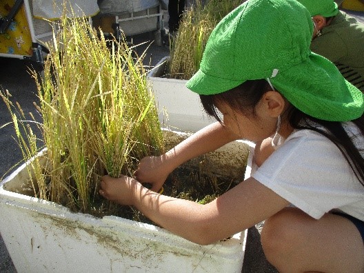 日頃食べているお米がどんなふうにできるのか絵本を読んで興味を持った子どもたちに、