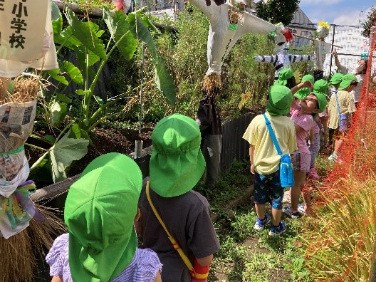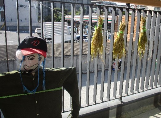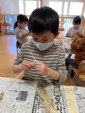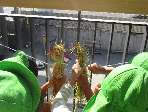 「美味しいお米になるように」と願いを込めて、クラス前のテラスに刈ったばかりの稲を干していた子ども達です。