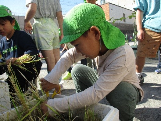 「きれいに切れるかな」と話しながら目を輝かせ、稲刈りをしました。
