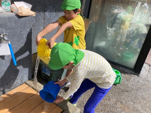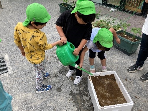 初めて触る土の感触を楽しみながら土をハッポースチロールに入れ、その上にジョウロで水を入れてかき混ぜます。