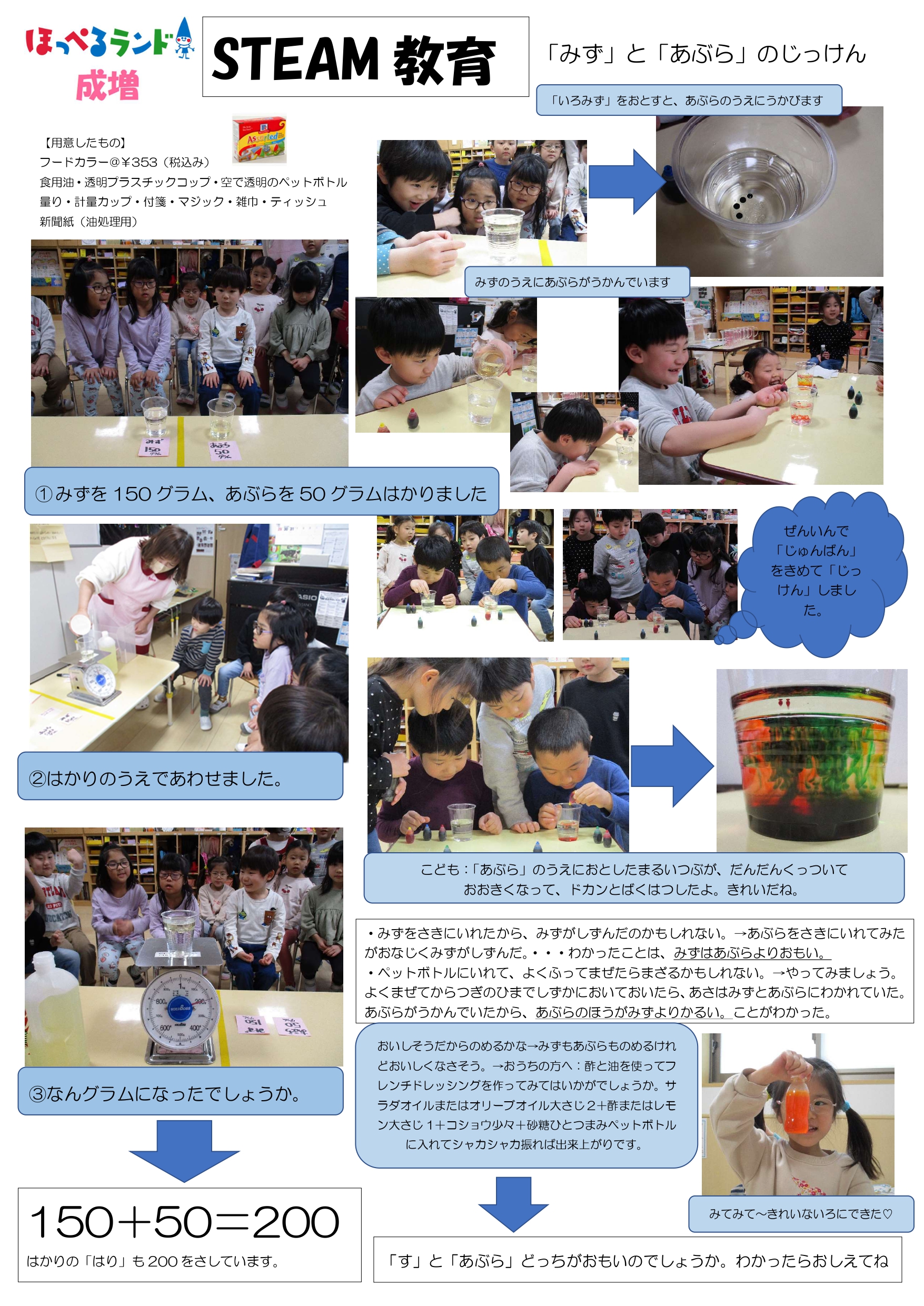 ほっぺるだより Letter TOP ほっぺるだより STEAM教育 「みず」と「あぶら」のじっけん ほっぺるランド 成増 STEAM教育 「みず」と「あぶら」のじっけん ほっぺるだより Letter ほっぺるランド 成増 NEW プレeSTEAM教育 ほっぺるランド 成増 遠足 ほっぺるランド 成増 【食育】この食材なんだ〈3歳児クラス〉